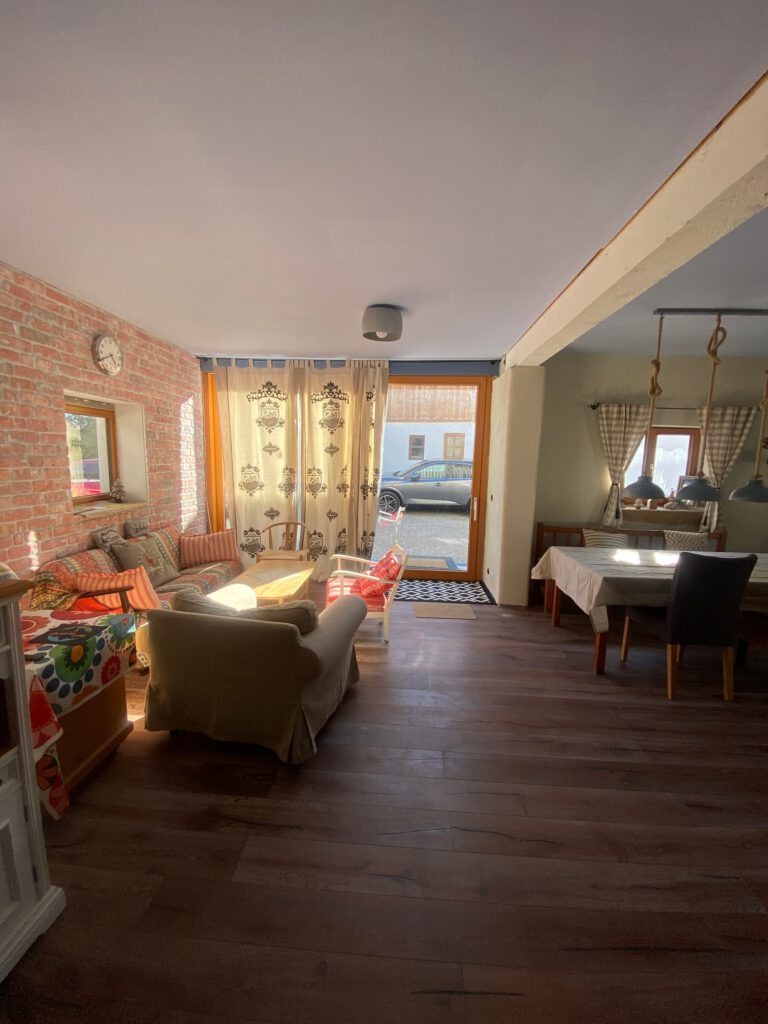 Das Herzstück der Tenne ist der große, gemütliche Aufenthaltsbereich mit rund 50 m² Fläche und einer offenen Küche. Hier könnt ihr gemeinsam kochen, essen, spielen oder einfach entspannte Abende verbringen – bei einem Glas Holunderschorle, guten Gesprächen oder einem Spieleabend für Spass, Spannung und Unterhaltung